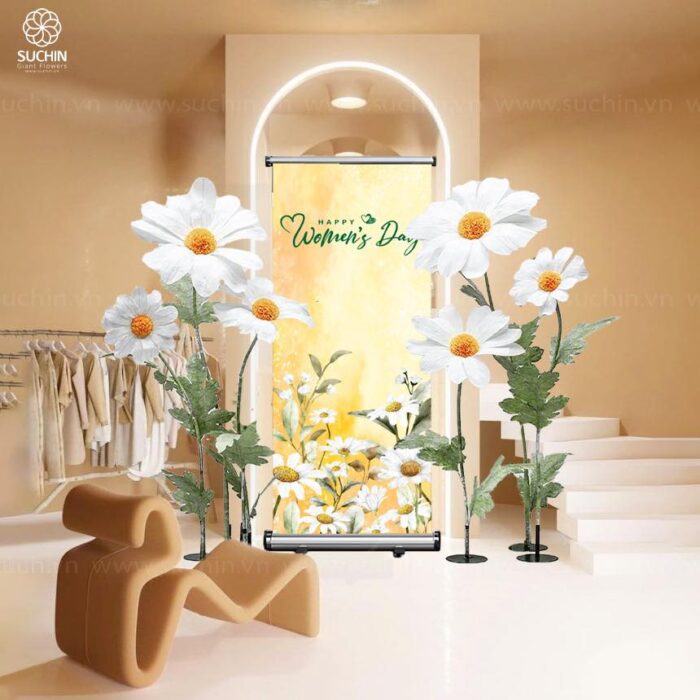 – Góc chụp ảnh: Cây cúc họa mi khổng lồ sẽ là điểm nhấn giúp cho bức hình của bạn trở nên nổi bật hơn bao giờ hết. Bạn có thể đặt cụm hoa cúc làm trung tâm. Kết hợp cùng với bóng bay, backdrop sẽ tạo ra một không gian check in vô cùng thu hút.