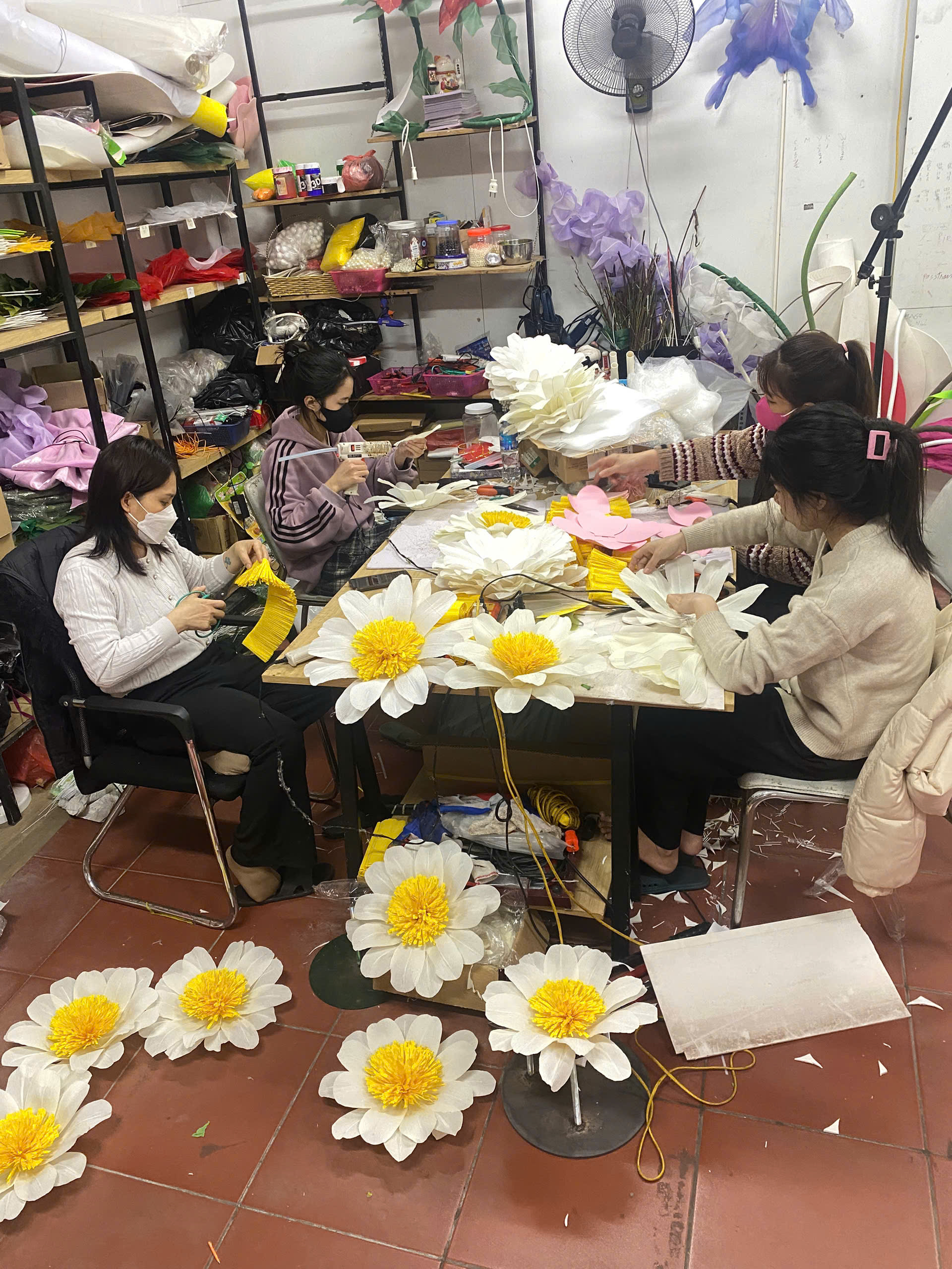 – Cánh hoa cúc họa mi được làm từ nguyên liệu giấy nhún hoặc vải voan.